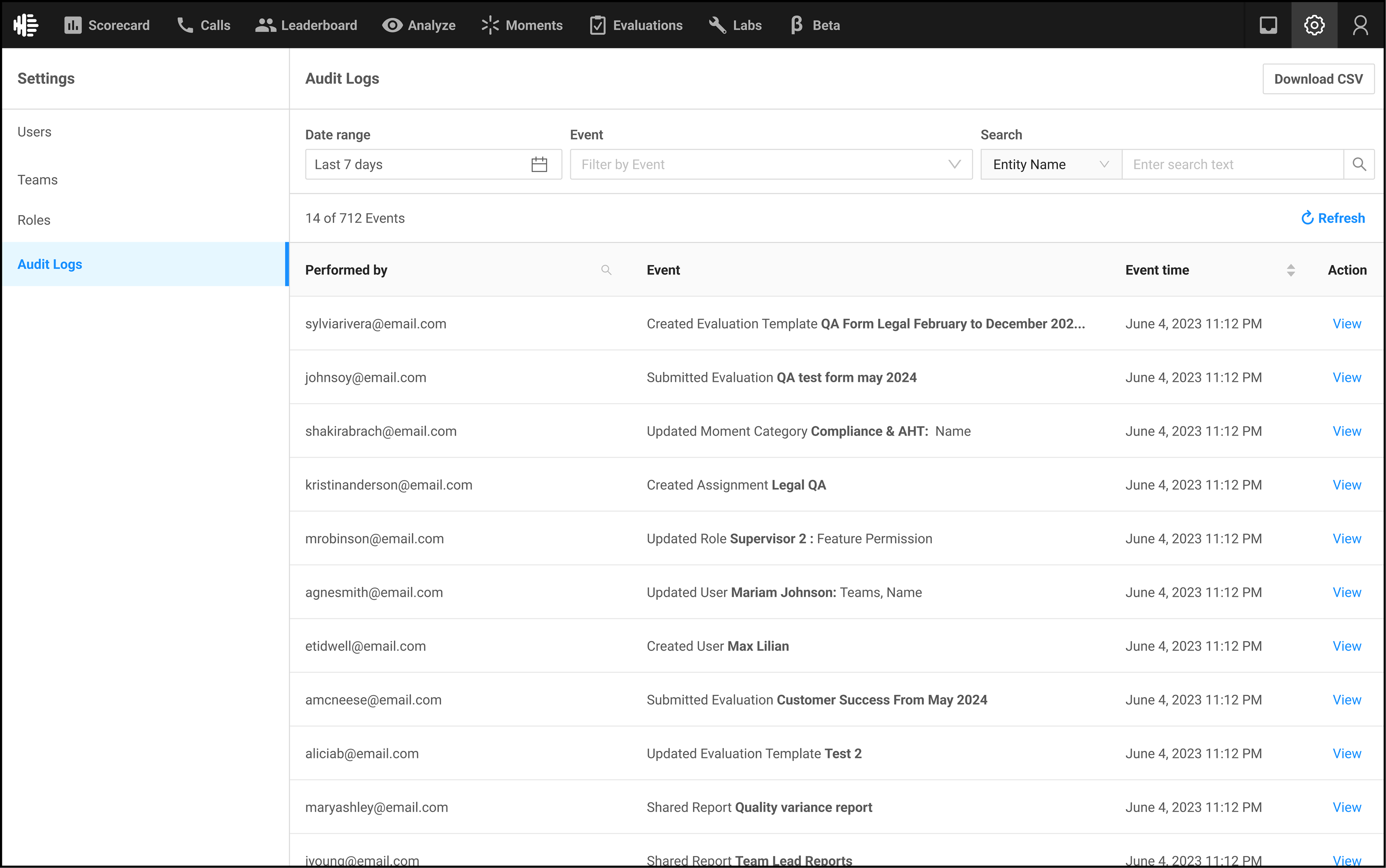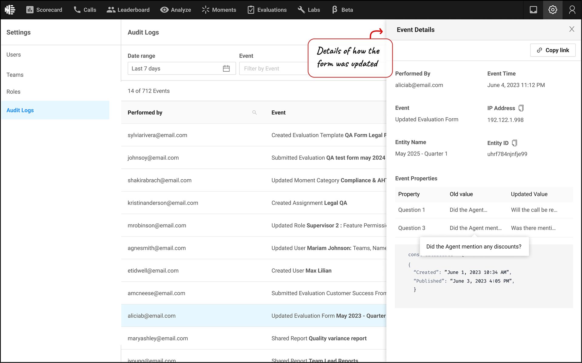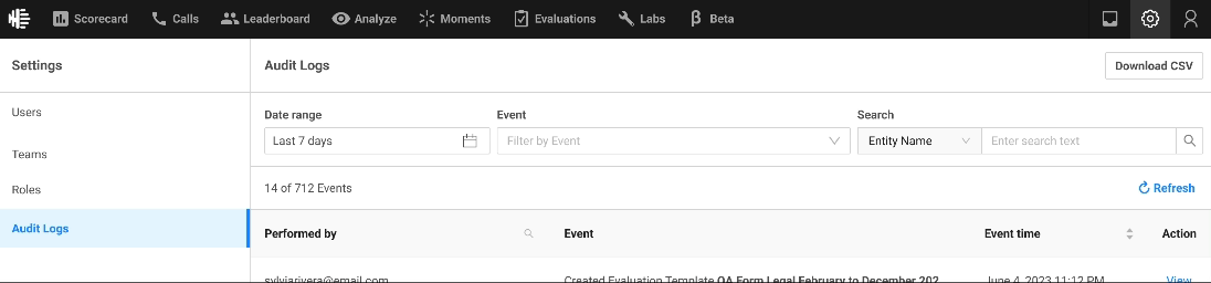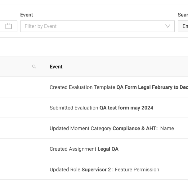 A place like an Audit Log also has opportunity to be used in new ways, if given access to different roles. It can be used as a checklist, to see if a certain task has been completed as per schedule. Or see the history of how a certain entity in the product has been modified over time - For example, from creating an Evaluation form, to submitting it, to it being acknowledged by an Agent.