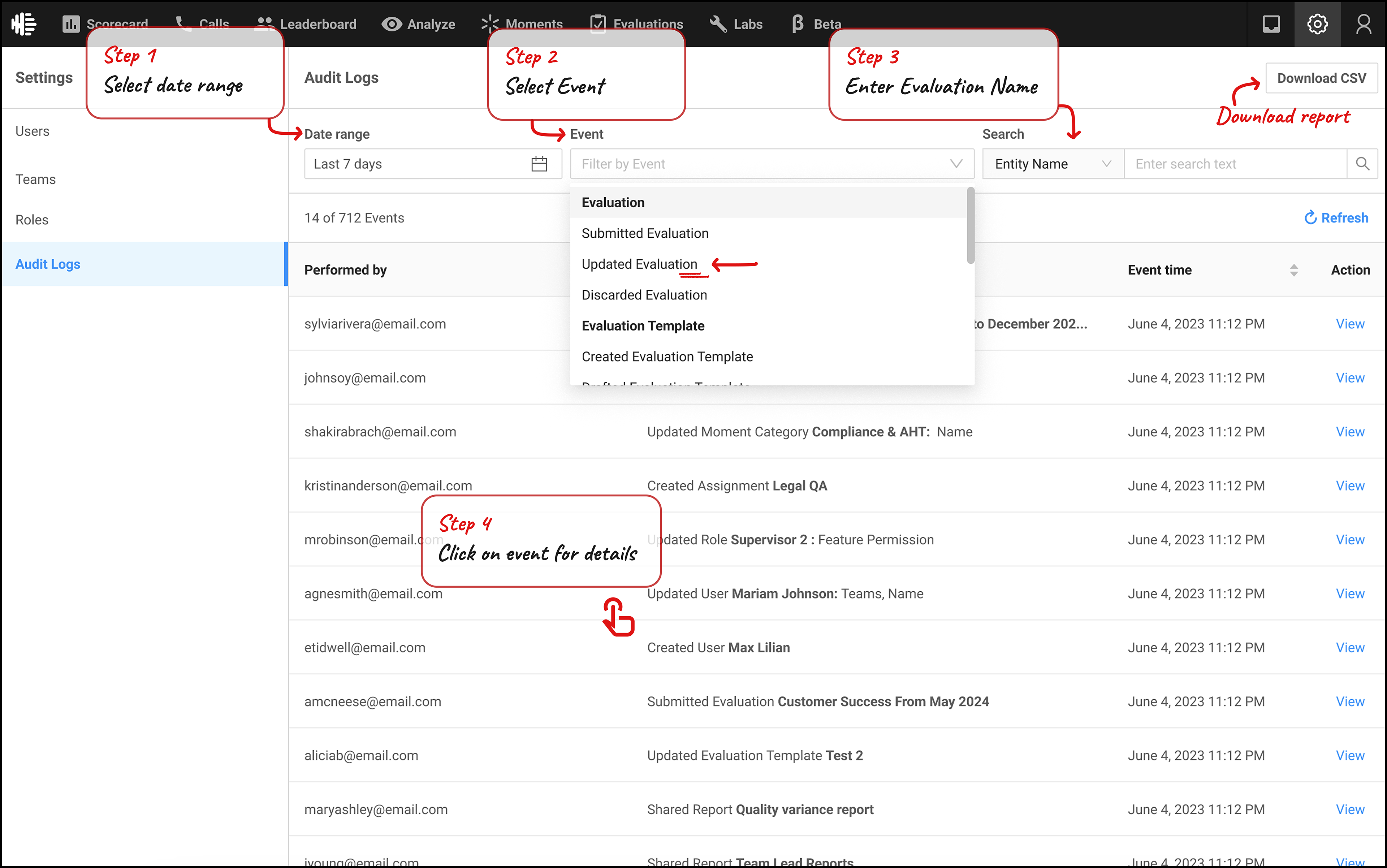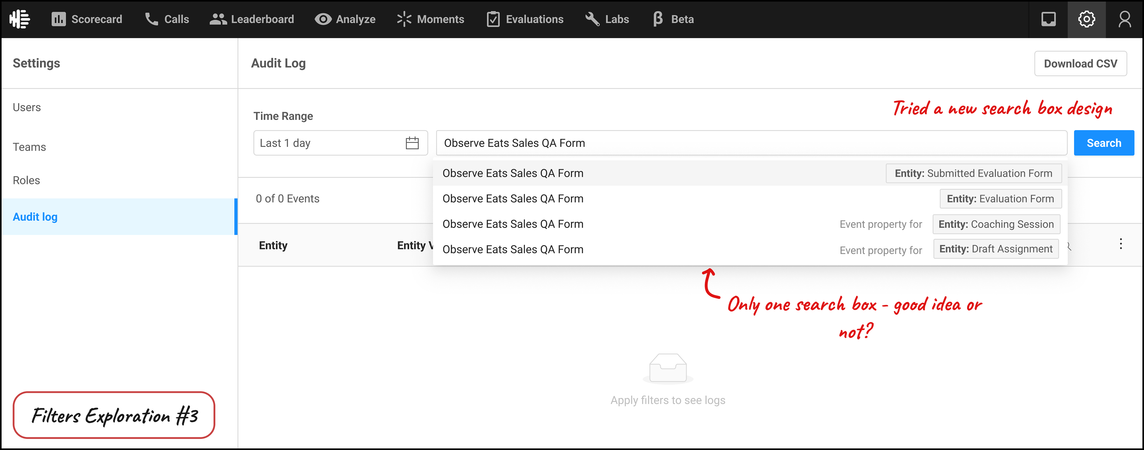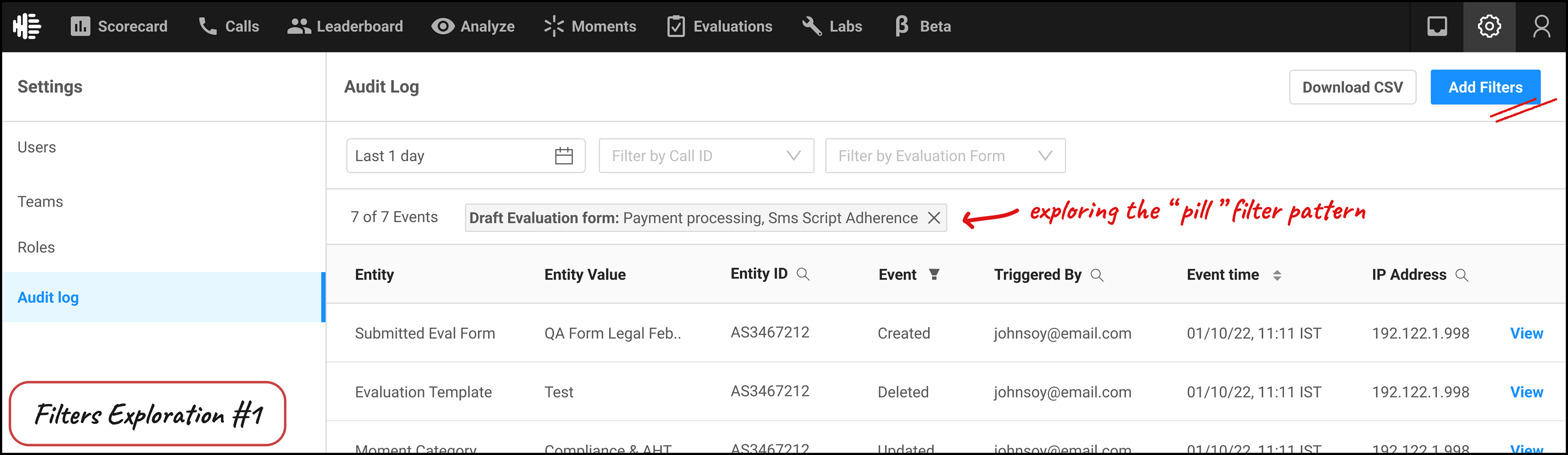 A place like an Audit Log also has opportunity to be used in new ways, if given access to different roles. It can be used as a checklist, to see if a certain task has been completed as per schedule. Or see the history of how a certain entity in the product has been modified over time - For example, from creating an Evaluation form, to submitting it, to it being acknowledged by an Agent.