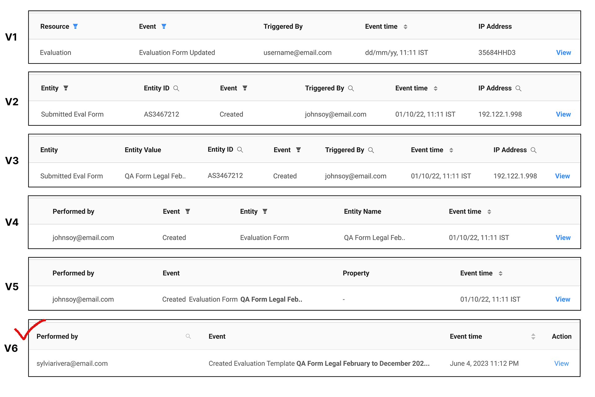 As many iterations were made, the column header also evolved. How do we show the information in the most readable manner? How do we make sure an event is not misinterpreted? What is the essential information to show upfront in the table, and what do we tuck away in the drawer?