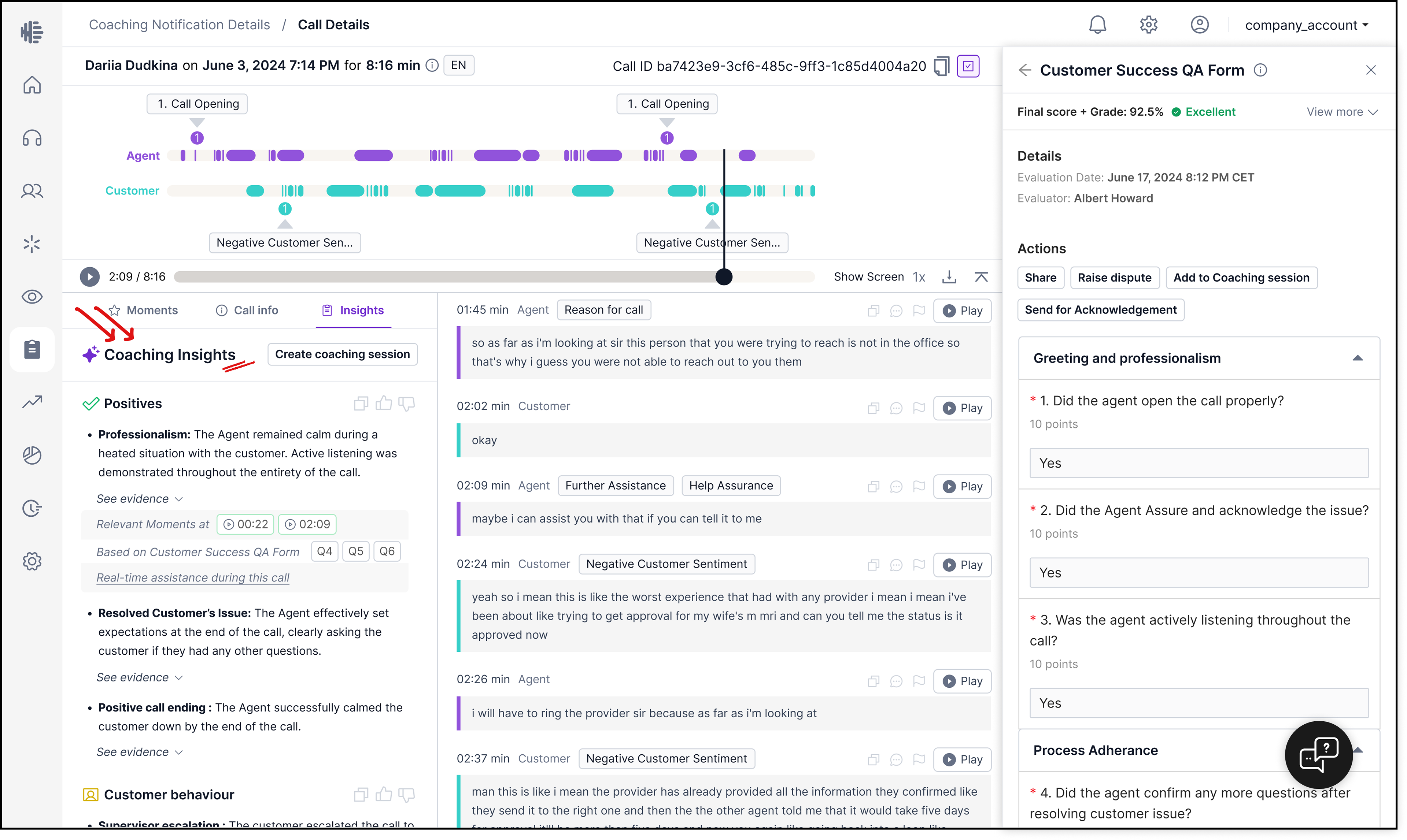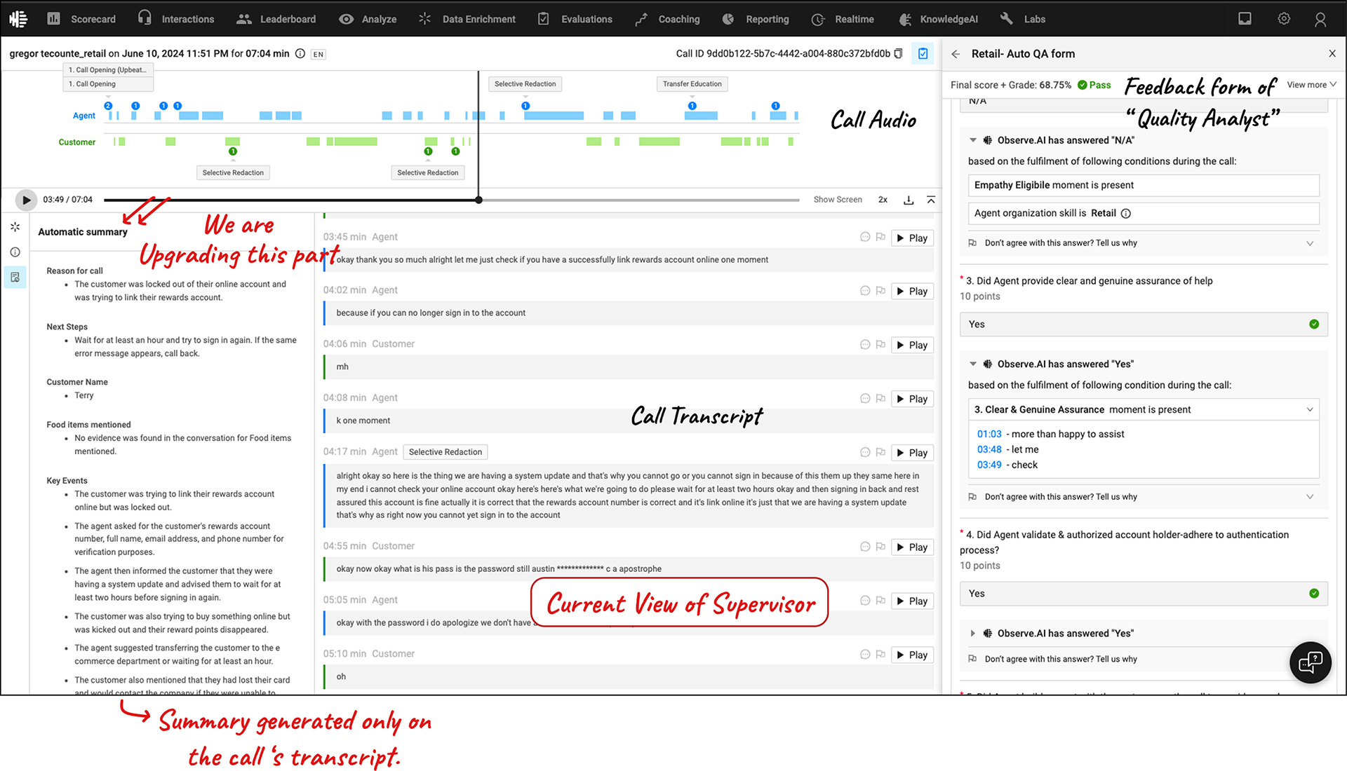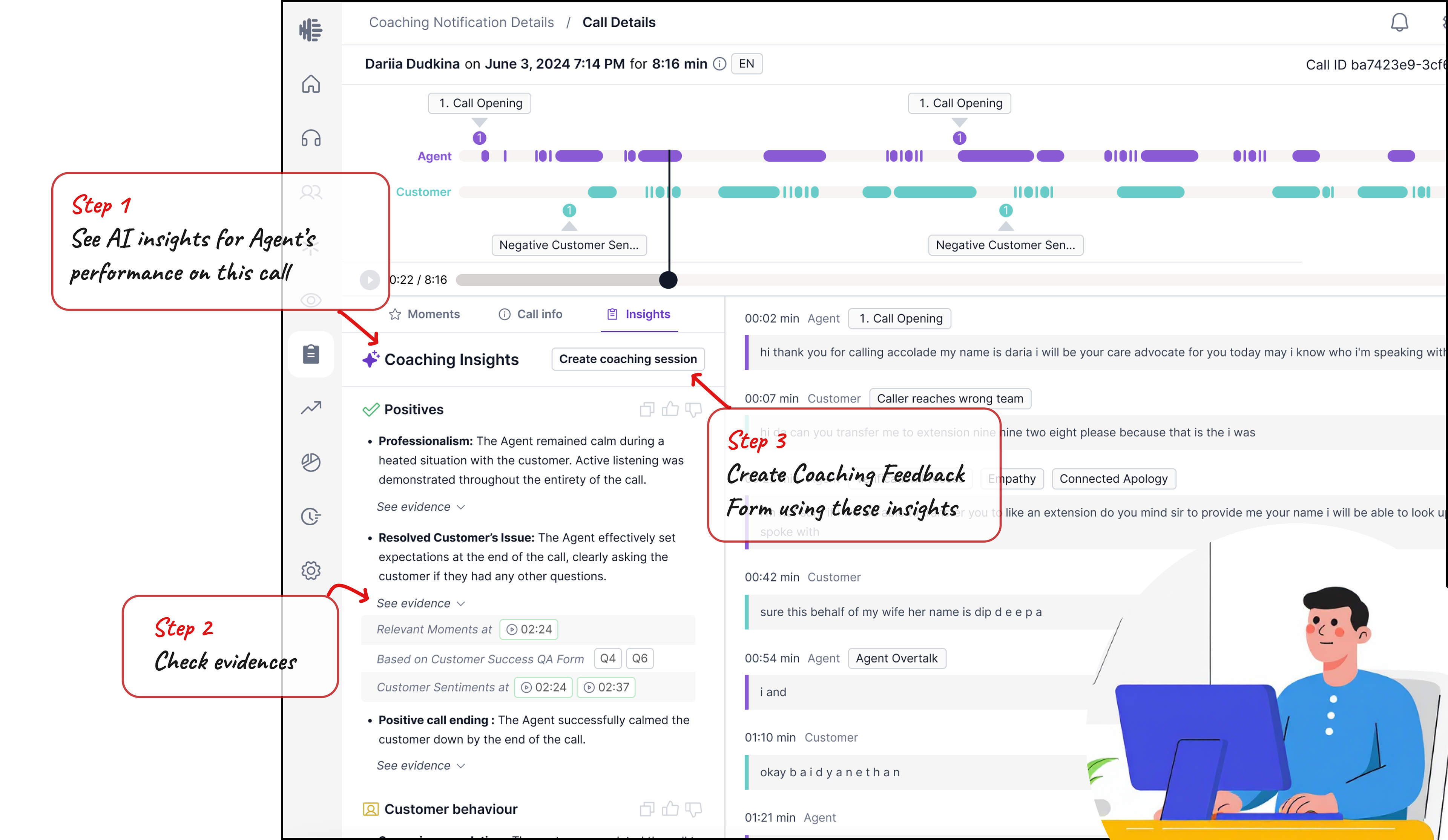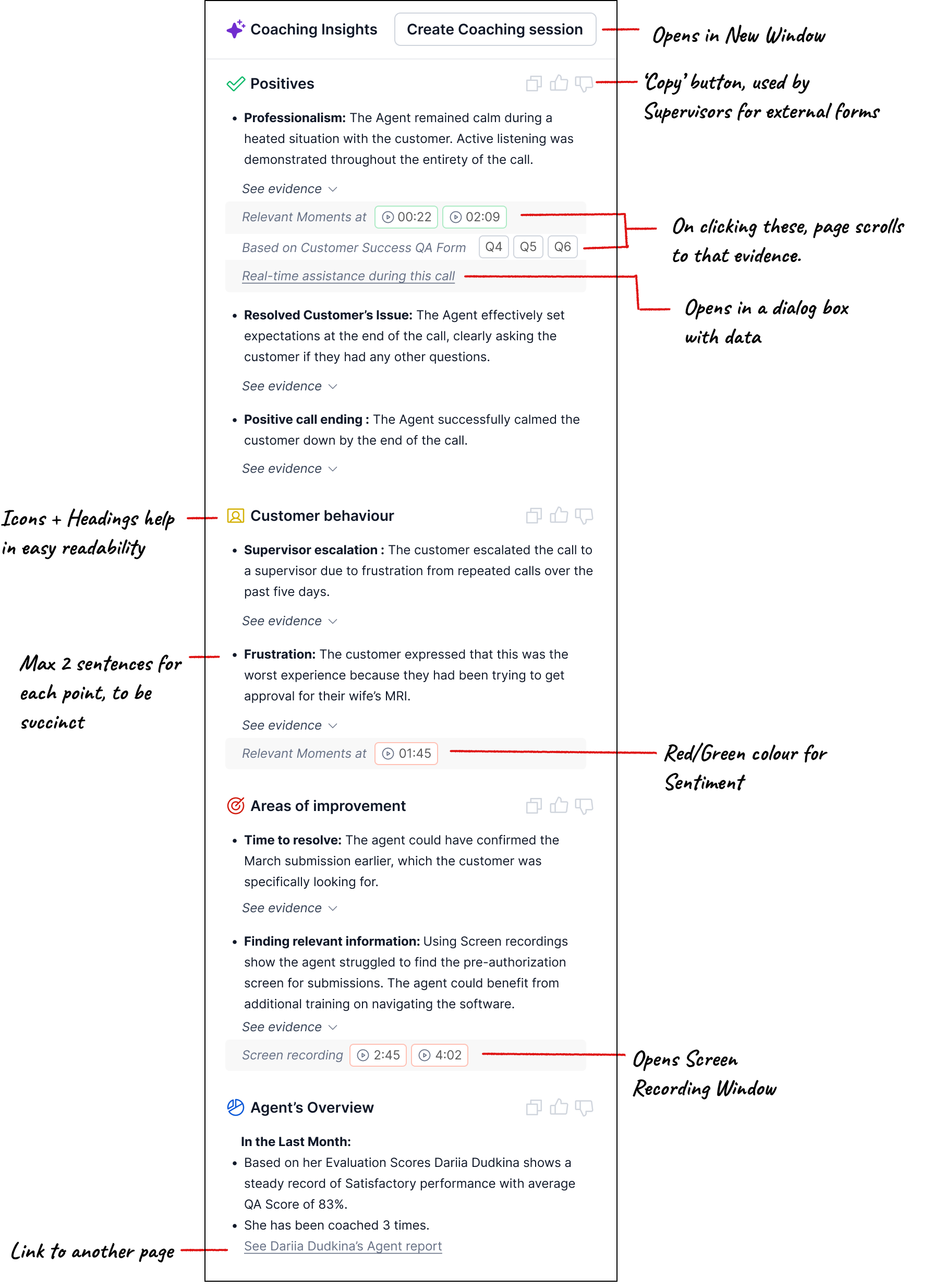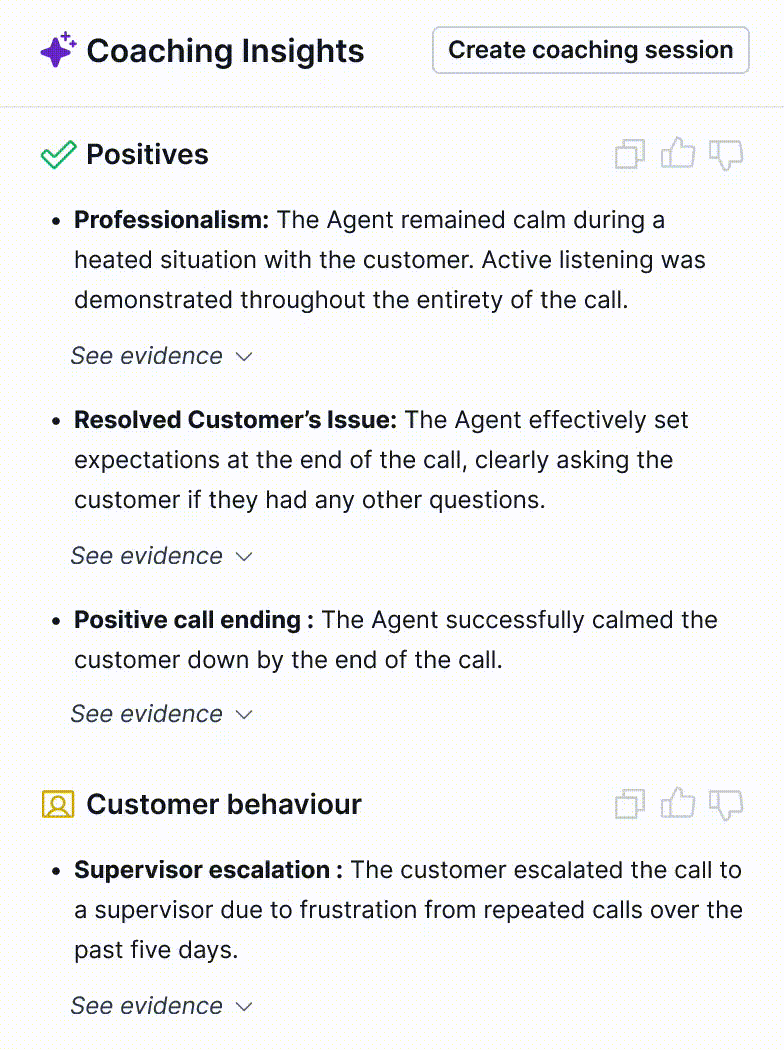 Coaching Insights is the intervention to reduce this time considerably. It provides a summarisation of the call with evidence based on all insights available on Observe.ai, not just the call transcript.